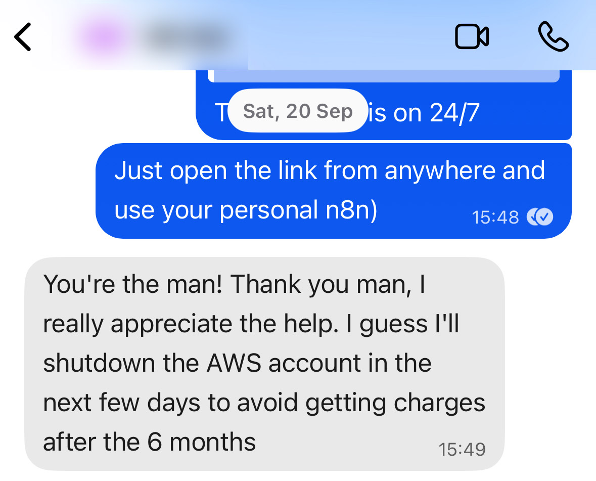 You sign up for AWS → Create an instance → Get the IP address → Configure the subdomain → Run the setup script for N8N → ✅ Done!